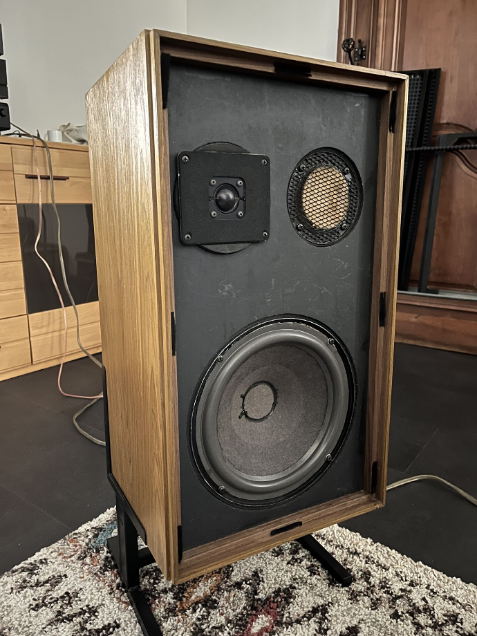 Trouvaille lors de l'achat d'une maison, une paire d'américaines emblématiques par Accoustic Research, les inventeurs des enceintes closes, dont ce modèle fait partie des premières produites par la marque. Une curiosité : un condensateur à deux voies, très ancien (et très largement en dérive). Les deux potentiomètres présents sur chaque enceinte ont été chuintés car hors service et inutiles. Suspensions des boomers changées, test des médiums et des tweeters. Au final, des enceintes exceptionnelles, un son très détaillé dans toutes les gammes, je comprends pourquoi ceux qui en ont ne s'en séparent pas !