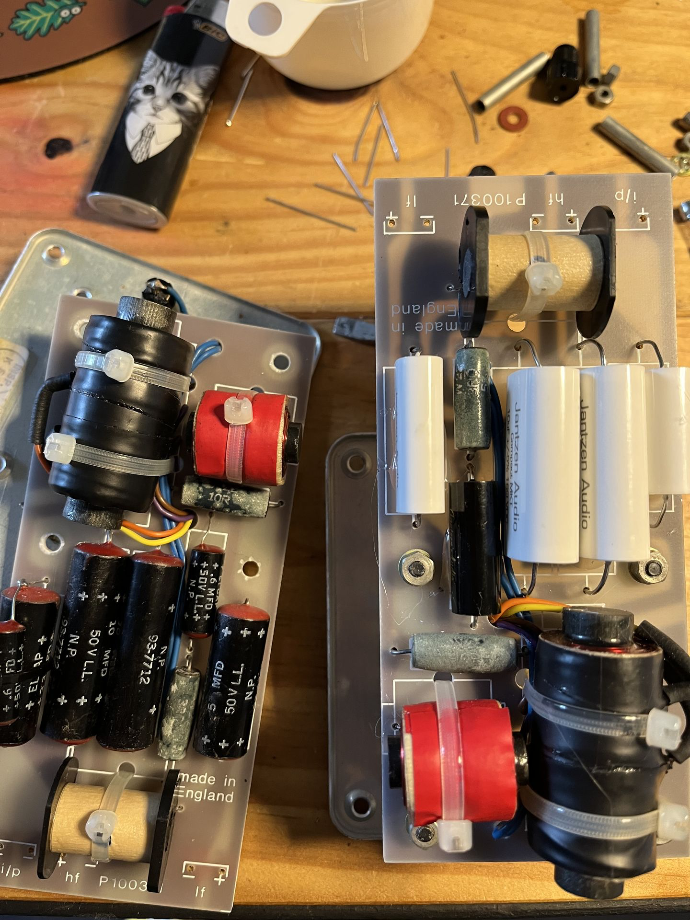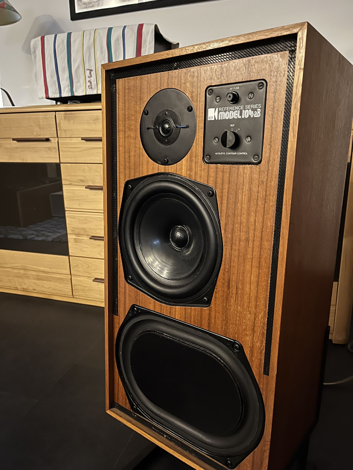 Réfection d'une paire d'enceintes KEF 104aB de 1978: filtres, commutateur d'aigus oxydés et petit nettoyage esthétique. Les composants ont dû être choisi avec soin : l'espace pour le laisser passer est très étroit, les fils très courts ! Une bien belle découverte musicale.